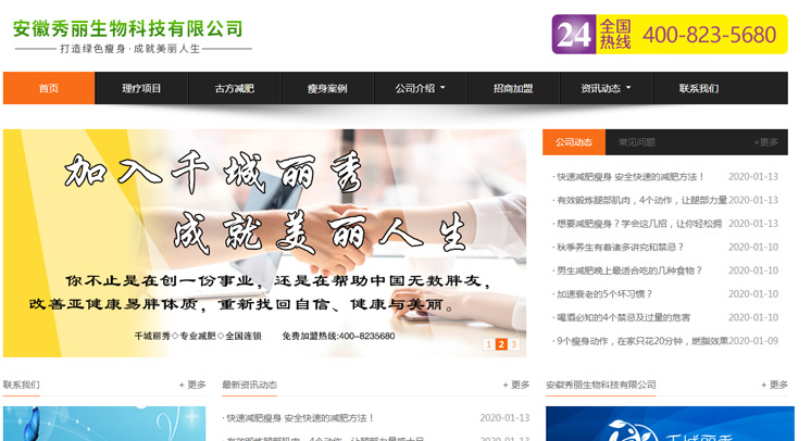 安徽秀丽生物科技有限公司专业从事“减肥”、“纤体”“养生”系列产品的研发,公司目前主要经营进口高品质仪器减肥、塑形、护肤、臀部理疗、产后恢复、艾灸、熏蒸、排酸等多种身体理疗项目,公司主打项目:古方减肥法,“清调补素养诊”集绿色、健康、有氧为一体,解决各种肥胖问题,能快速去除肥胖的多余脂肪,不吃药、不手术!一次可减1至3斤,一疗程可减8至40斤,一次减肥,轻松享瘦!做到“清调补素养诊”,清:清身体毒素、脂肪,调:调理身体内分泌、亚健康,补:补充身体所需能量,塑:塑造S身材曲线,养:养生减肥一步到位,诊:根据不同的人,不同肥胖类型,设定不同方案,让每一个爱美的你都能绿色减肥的同时获得健康养生,千城丽秀生物科技有限公司衷心希望携手每一位有缘人共享高品质,成就美丽人生!