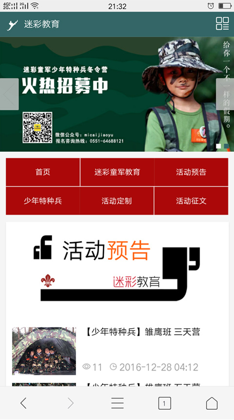 深圳市迷彩文化传播有限公司成立于2011年6月,旗下按成立顺序分别有迷彩战士、迷彩童军和迷彩公益等品牌项目,专业从事青少年营地教育。迷彩战士成立于2009年5月,迷彩童军教育其它项目均有迷彩战士活动衍生而来,迷彩童军教育专注青少儿生命、生活、生存、旅学主题,其研发课程“少年特种兵和少年探险家”两大特色课程,专注于青少儿营地教育;培养未来优秀公民和社会精英。迷彩公益组织联盟专注迷彩童军活动的对外推广与合作。